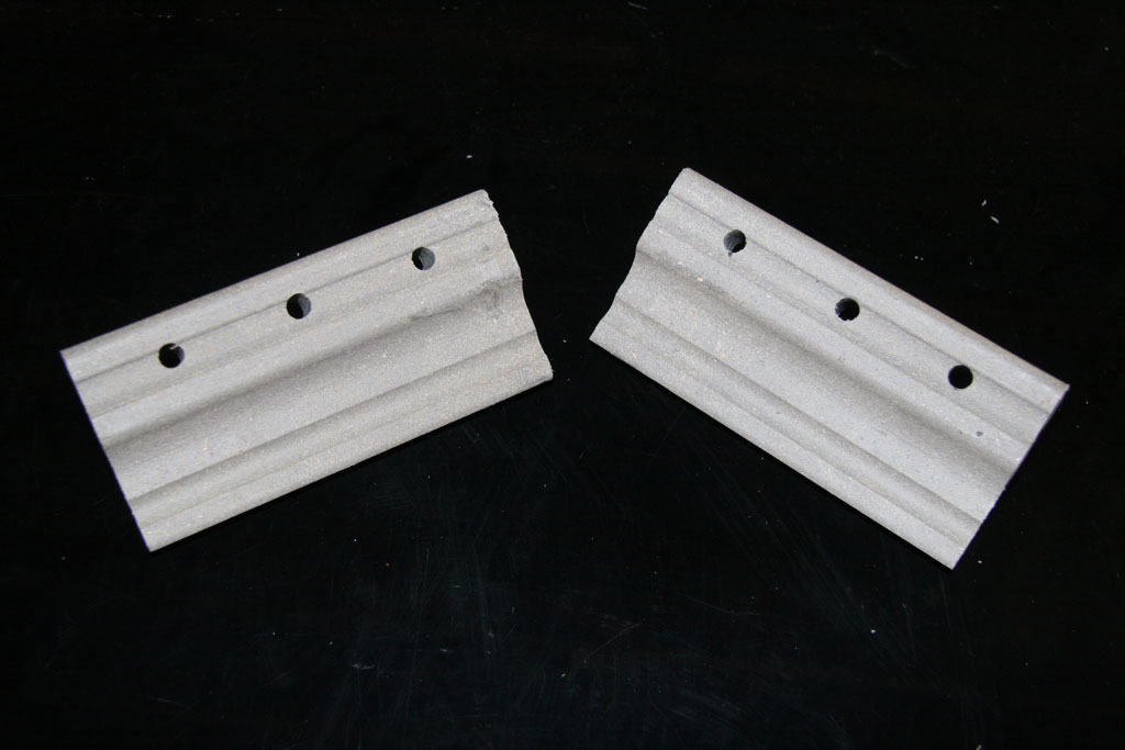 I knew the material was the right shape, but it was still too big, and needed to be trimmed. With that in mind, I placed each of the 6-inch blocks across the bottom rail of the side racks, and drew a line across the block. I also knew that the cases have ribs across the backs, so I measured these (roughly), and added that to the marked width. This turned out to be about 2 inches, so I marked a new line across the blocks, then trimmed them down with my table saw. |
