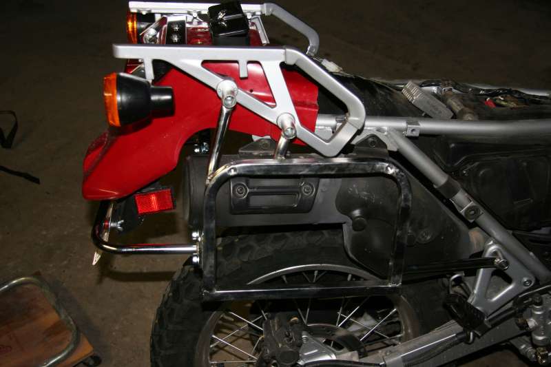 I just followed the same procedure for the other side, and that was that...cases all mounted up and ready for whatever! NOTE: The two bolts in the top of the case as pictured are NOT the final ones I used! They are just what I had on hand at the time. After I got the cases mounted, I went to the hardware store (have to ride 25 miles!) to get the stainless hardware that is in place now.) |